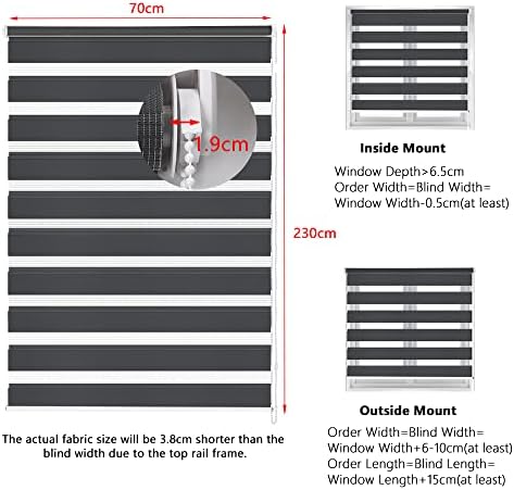 Product Dimensions: 70cm x 230cm. Color: Dark Grey. Attention: Fabric width is 3.8cm narrower than overall blind width due to upper rail frame. For a blind measuring 70 cm, the width of the fabric is approximately 66.2 cm. If you have any questions about size selection, please contact us.